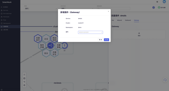 从整体的流量试图中可以看到本地微服务(一个Demo微服务,来自GitHub)的架构组成。每个服务节点都可以点开SolarMesh的控制面板,包括:总览、路由规则、流量策略、流量安全、网关、服务质量、流量插件。