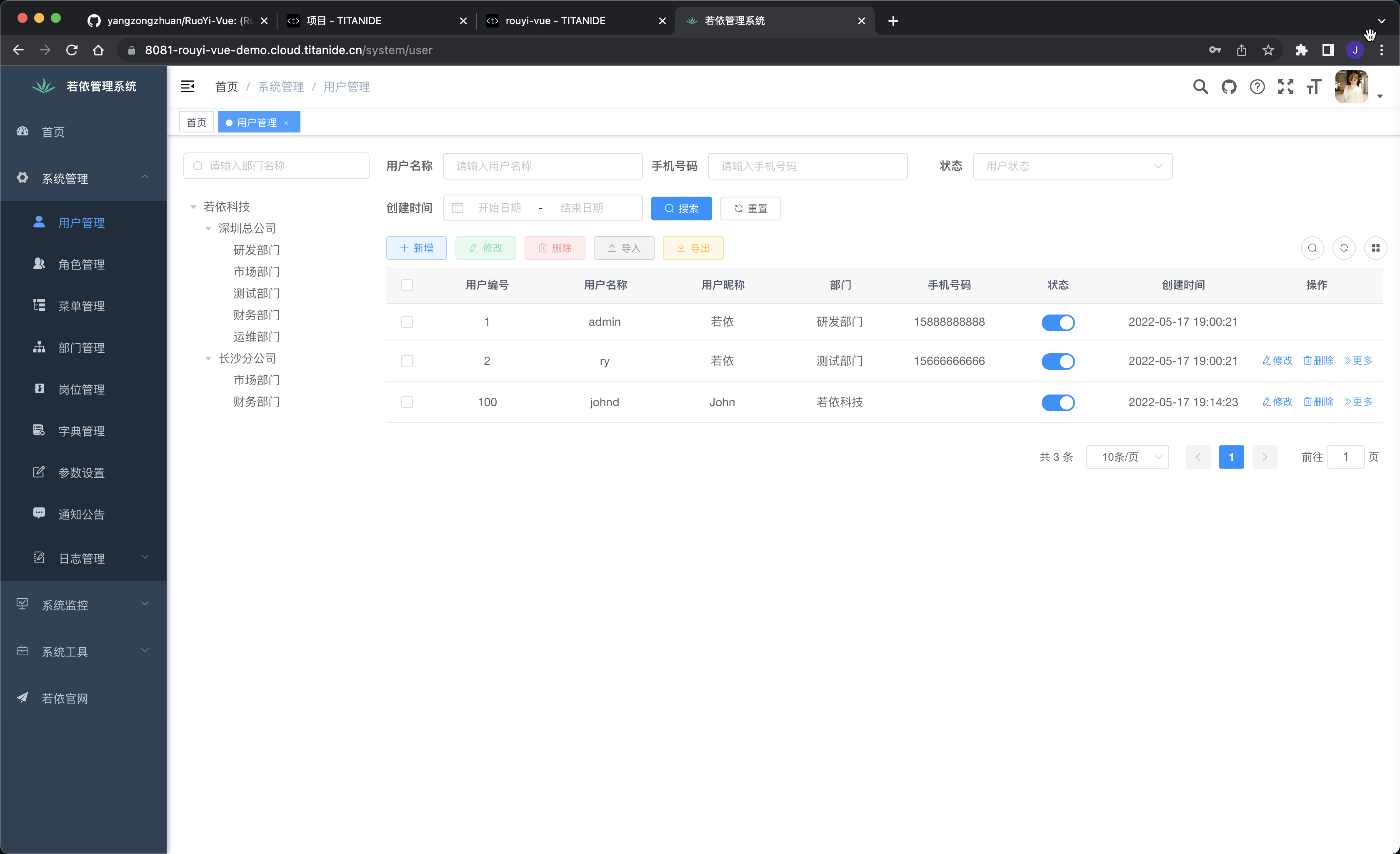 https://github.com/yangzongzhuan/RuoYi-Vue.git),通过创建 URL 导入的方式创建 TITANIDE 项目。